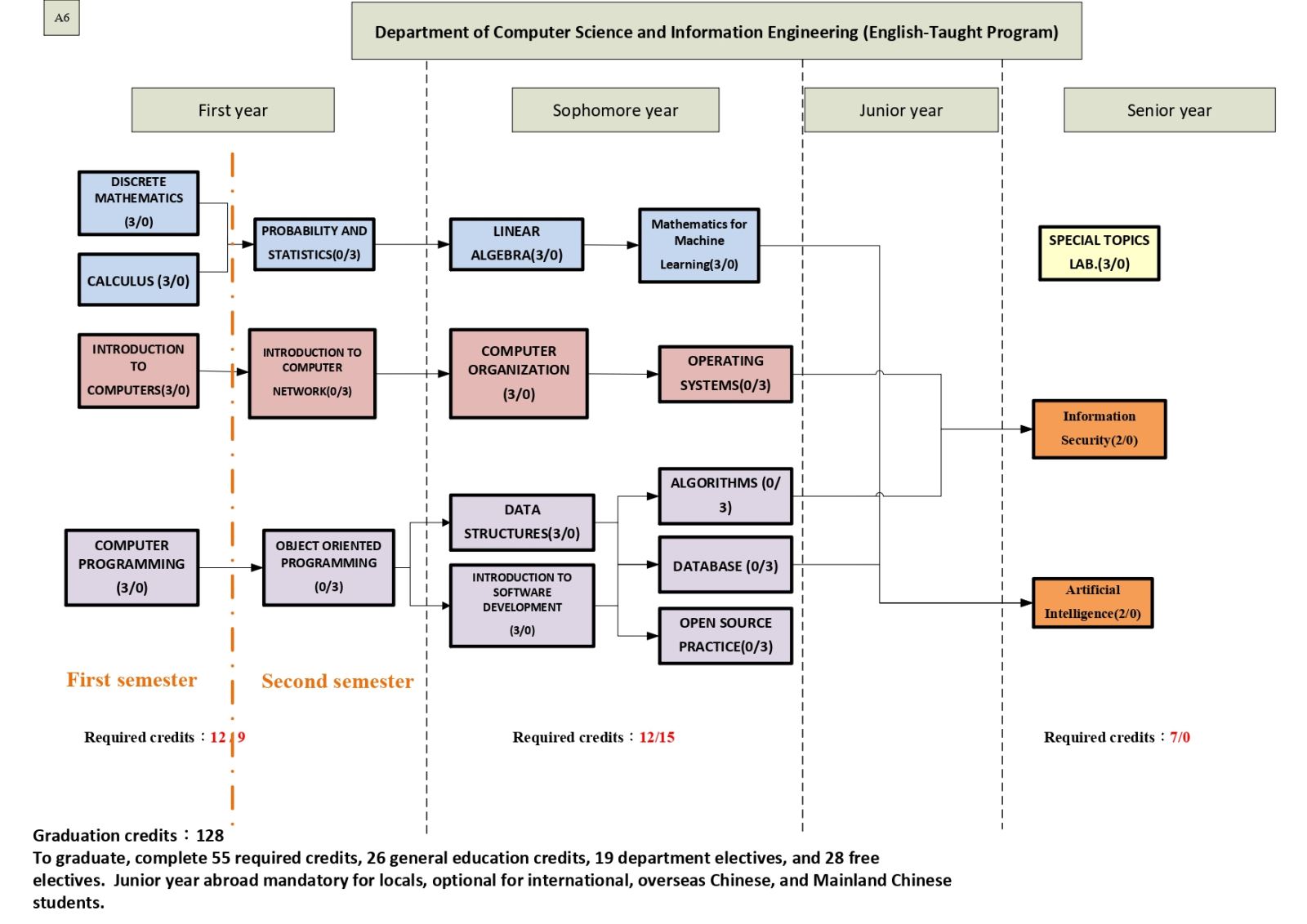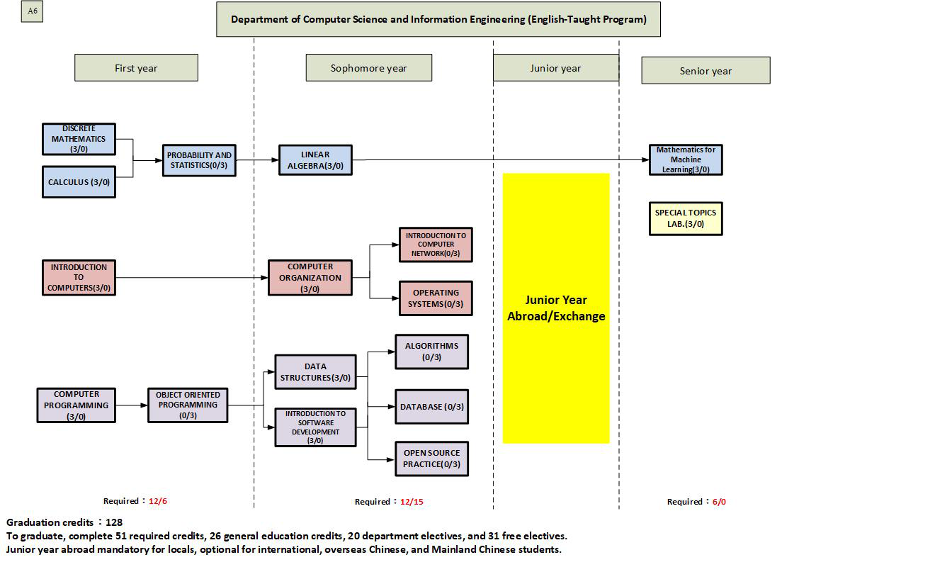 To graduate, complete 51 required credits,26general credits, 22 department electives, and 29 free electives.